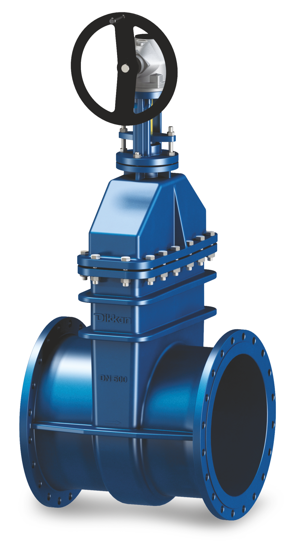 with handwheel. Multi-turn bevel type gearboxes provide low forces to operate the valve